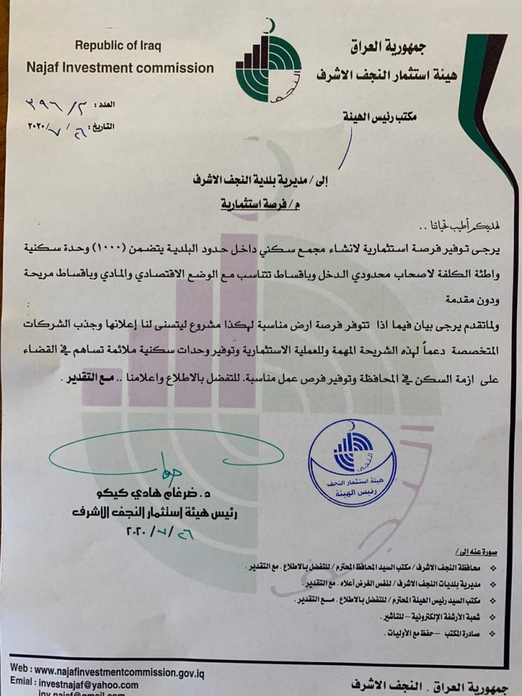 استثمارالنجف الاشرف يسعى لأنشاء (١٠٠٠) وحدة سكنية واطئة الكلفة لذوي الدخل المحدود