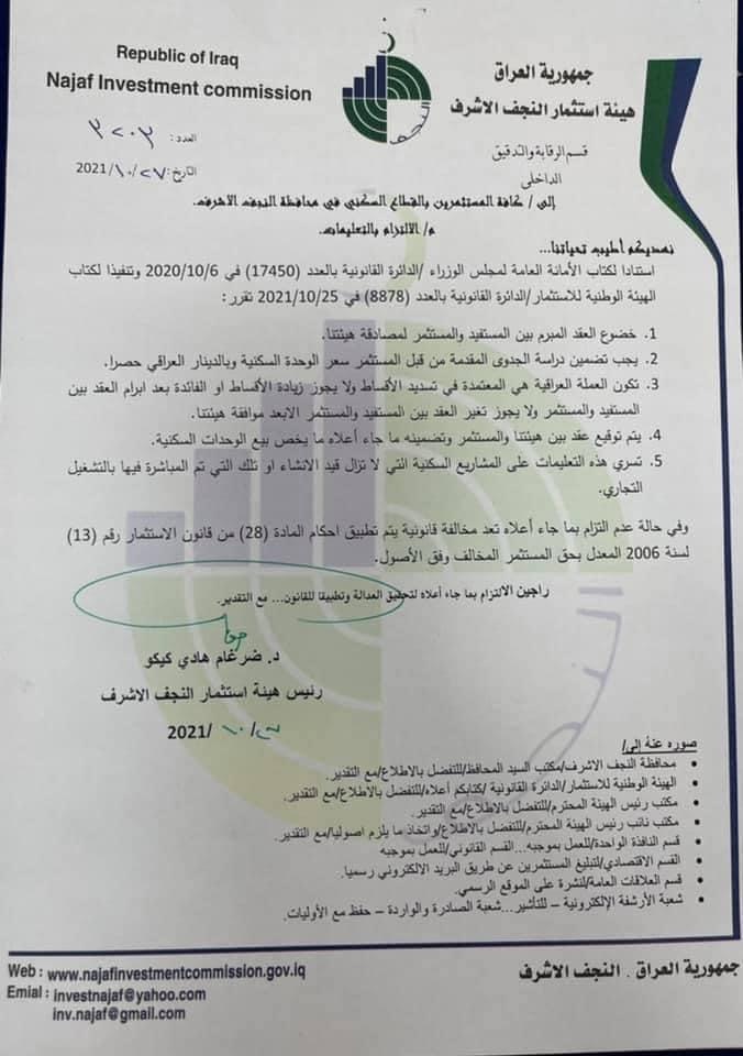 استثمار النجف الاشرف تصدر تعليمات مشددة للمستثمرين بالمجمعات السكنية تهدف لحماية المستفيدين من التلاعب والاحتيال