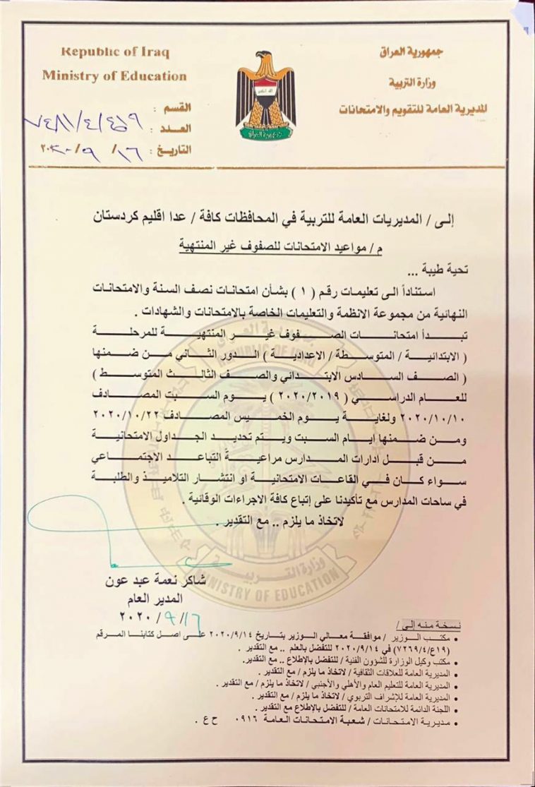 وذكر بيان صادر عن المكتب الإعلامي أن ، المديرية العامة للتقويم والامتحانات وجهت المديريات العامة للتربية في المحافظات كافة / عدا اقليم كردستان ، باعتماد يوم السبت المصادف الـ10 من تشرين الاول المقبل ، موعداً لإجراء امتحانات الدور الثاني للصفوف غير المنتهية للمرحلة (الابتدائية ، المتوسطة ، الإعدادية) ومن ضمنها (الصف السادس الابتدائي والصف الثالث المتوسط) للعام الدراسي الحالي .