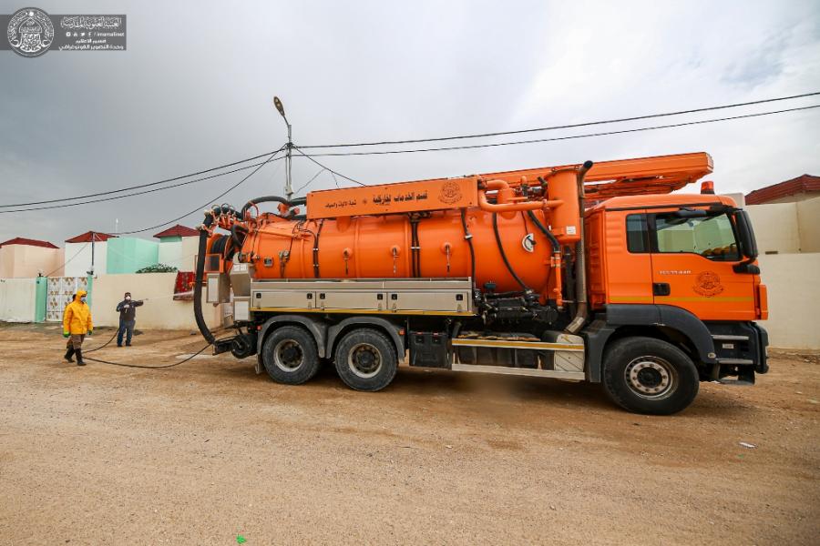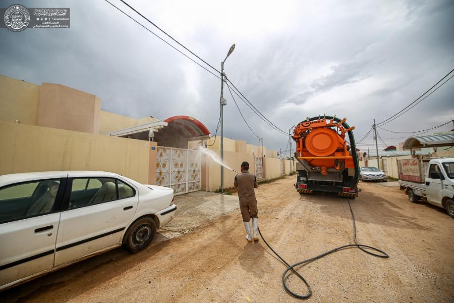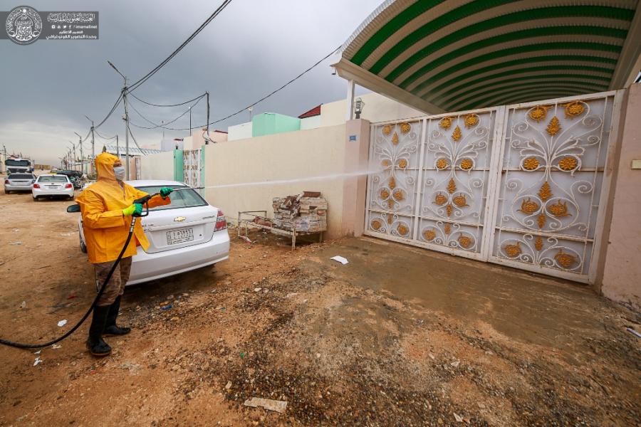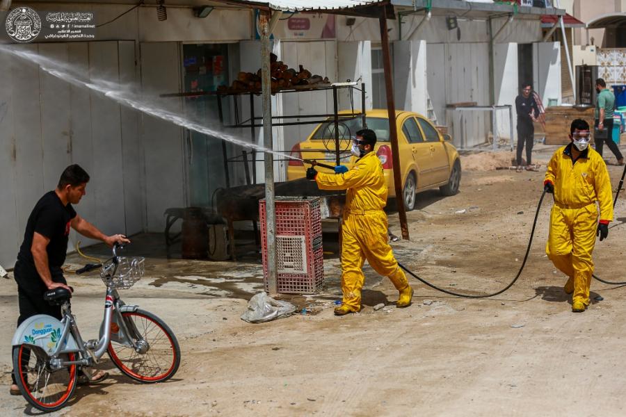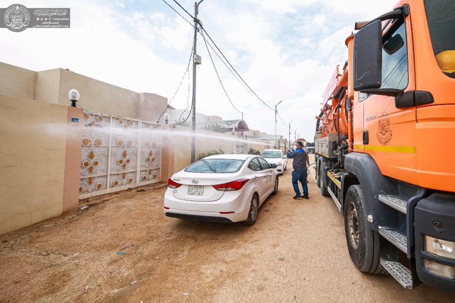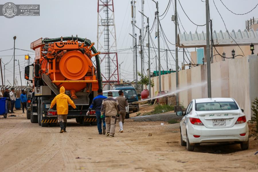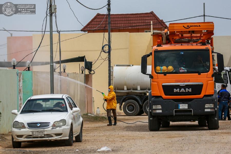 تواصل الكوادر الميدانية العاملة في قسم السلامة المهنية والصحة والبيئة في العتبة العلوية المقدسة بحملات العفير والتعقيم للوقاية من فيروس كورونا.