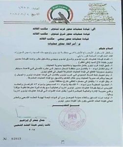 وجاءت في الوثيقة انه “تم الغاء مضمون كتابي هيئة الحشد الشعبي، الاول يتعلق بالغاء محاور عمليات غرب نينوى وشرق نينوى وبيجي ونقل اللواء المتواجد في سنجار، والاخر يتضمن اخراج مقرات الالوية من المدن”.