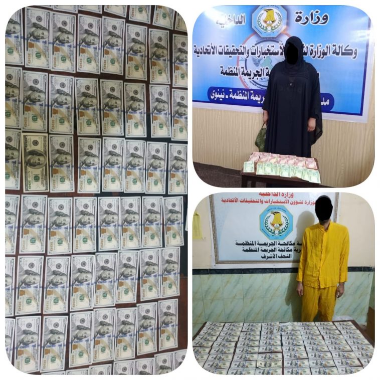 تمكنت مفارز وكالة الاستخبارات المتمثلة بأستخبارات الجريمة المنظمة نينوى والنجف الأشرف في وزارة الداخلية من القاء القبض على متهمين اثنين يتاجران بالترويج وبيع العملة المزيفة وبعد نصب كمين محكم تم إلقاء القبض على احدهم في منطقة حي القدس في محافظة النجف الأشرف متلبسا”بالجرم المشهود وبحوزته (٨٩٠٠) ثمان مائة وتسعون الف دولار أمريكي فئة ١٠٠دولار مزيف داخل عجلتة أثناء بيعة (١٠٠) دولار مزور مقابل (٣٥) الف دينار عراقي، فيما تم القبض على متهمة تقوم بشراء مواد غذائية مقابل عملة مزيفة بأسواق مدينة الموصل وقد ضبط بحوزتها (٢٧٥) مئتان وسبعة وخمسون الف دينار عراقي فئة (٢٥ و ١٠) الاف مزورة