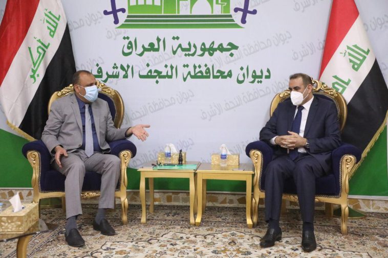 استقبل محافظ النجف الاشرف السيد لؤي الياسري في مكتبه وزير التخطيط الدكتور خالد بتال والوفد المرافق له من الوزارة حيث تم خلال اللقاء مناقشة عدة ملفات مهمة منها اطلاق المخصصات المالية لاكمال المشاريع المهمة في قطاعات الصحة والتعليم والطرق والمدارس ومشروع مبزل نهر الفرات .
