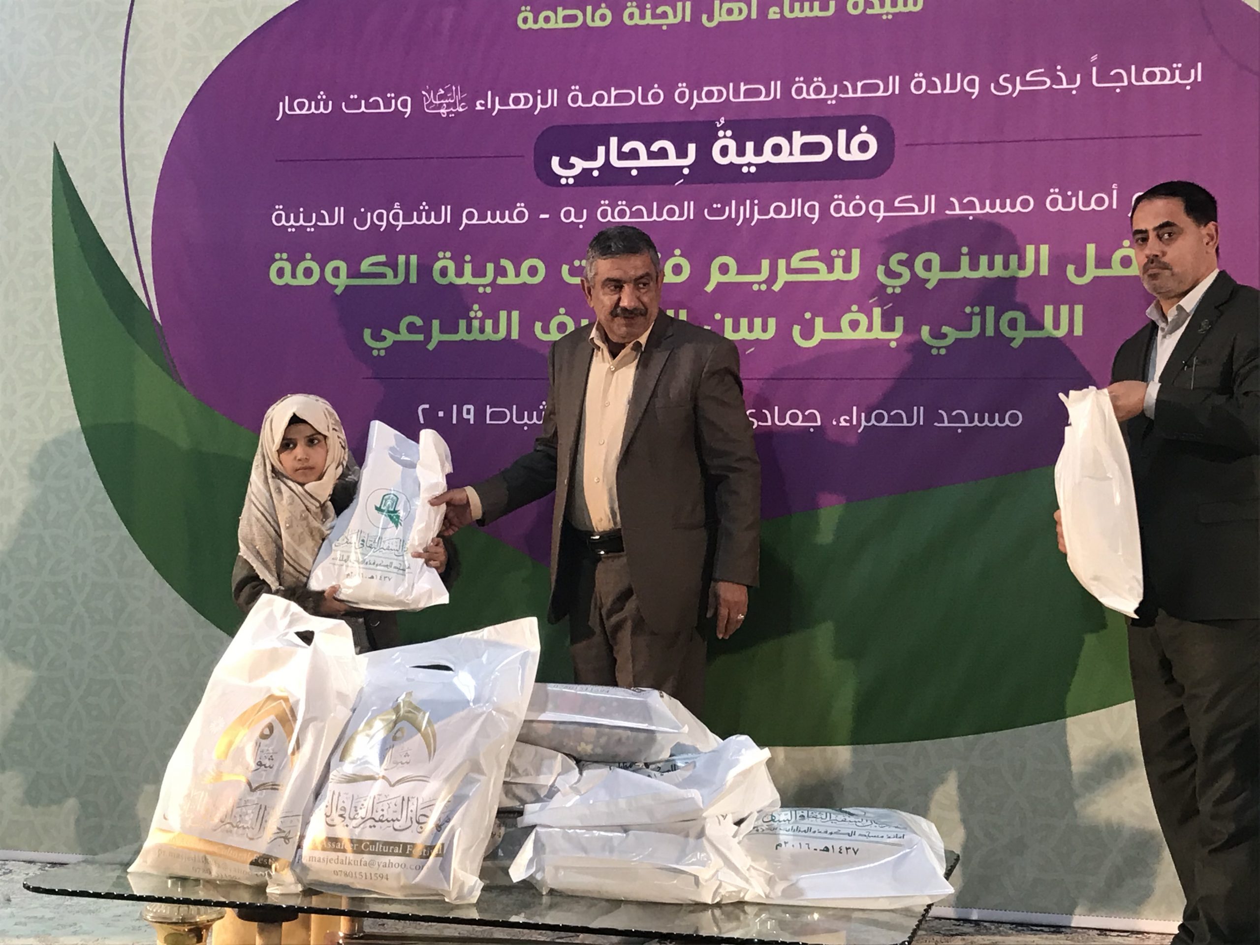 احتفالا بذكرى ولادة الصديقة فاطمة الزهراء ع وتحت شعار فاطمية بحجابي اقامت امانة مسجد الكوفة المعظم والمزارات الملحقة به حفلها السنوي لتكريم الفتيات اللاوتي بلغن سن التكليف الشرعي في مسجد الحمراء في الكوفة العلوية.