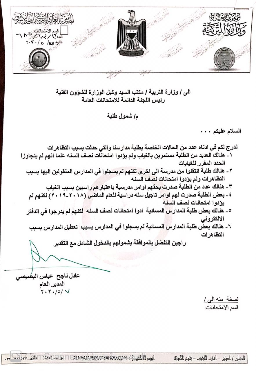طالب المدير العام للتربية في محافظة النجف الاشرف الدكتور عادل البصيصي وزارة التربية بشمول الطلبة المفصولين والمتغيبين عن الدوام وبعض حالات عدم الانتظام بالدوام بشمولهم بأداء الامتحانات الوزارية اسوة بأقرانهم.