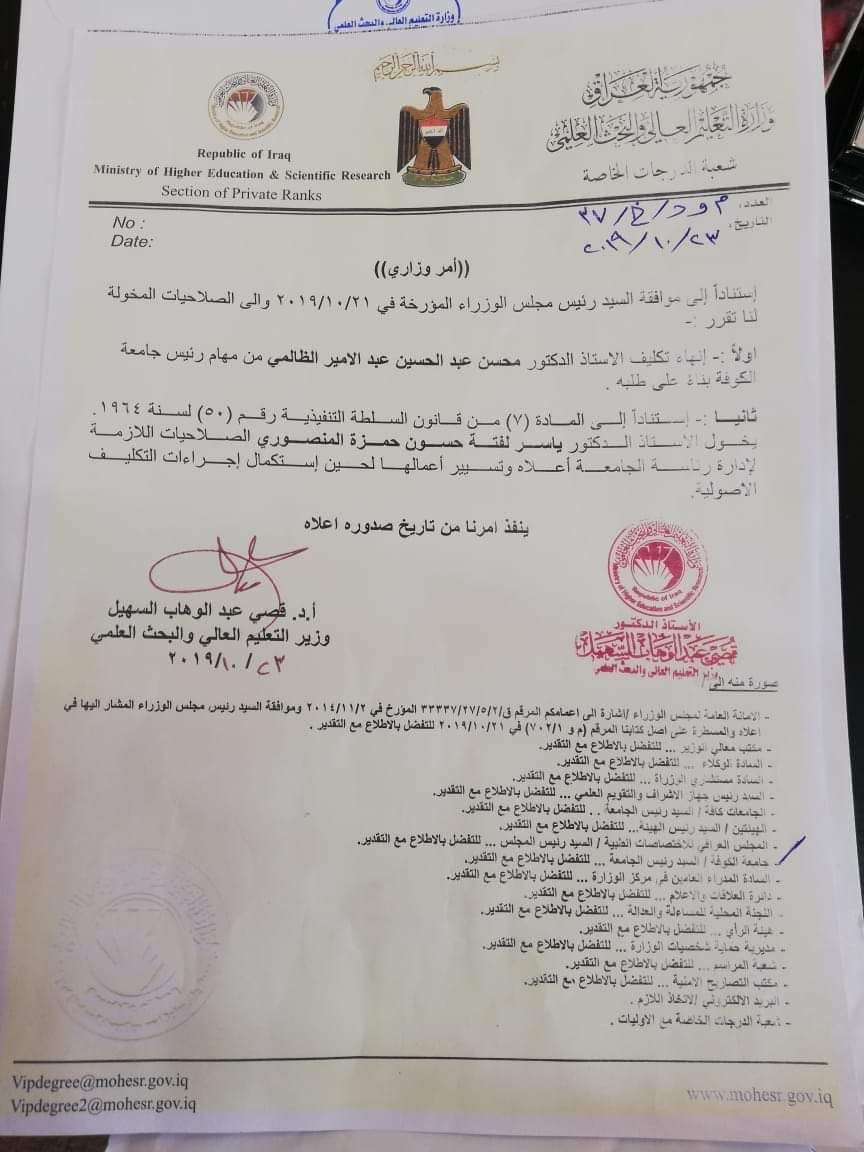 التعليم العالي تصدر كتاب انهاء تكليف رئيس جامعة الكوفة الدكتور محسن الظالمي من مهامه بناءا على طلبه وتخويل الدكتور ياسر لفتة المنصوري بتسيير الاعمال لحين اكمال اجراءات التكليف الاصولية.