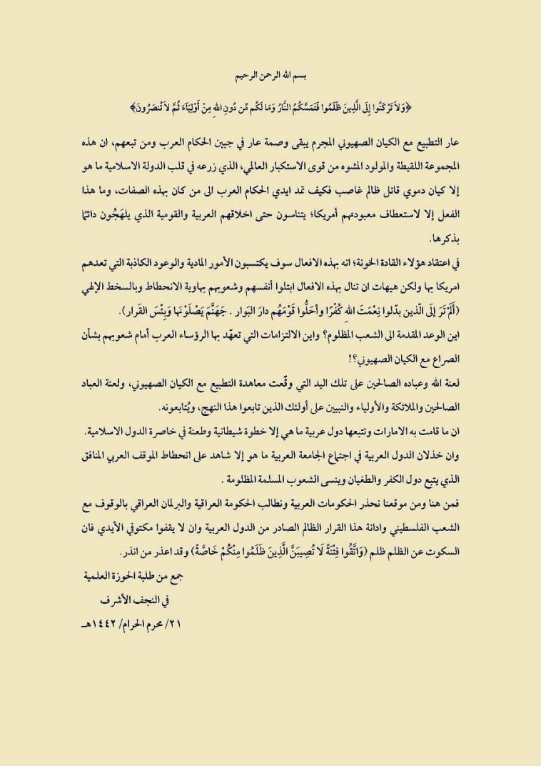 اصدر مجموعة من طلبة الحوزة العلمية في النجف الاشرف بيانا حول تطبيع الدول العربية مع اسرائيل وجاء في نص البيان: