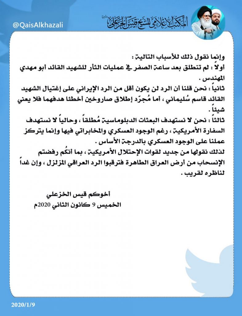 ثانياً : نحن قلنا أن الرد لن يكون أقل من الرد الإيراني على إغتيال الشهيد القائد قاسم سُليماني ، أما مُجرّد إطلاق صاروخين أخطئا هدفهما فلا يعني شيئاً .