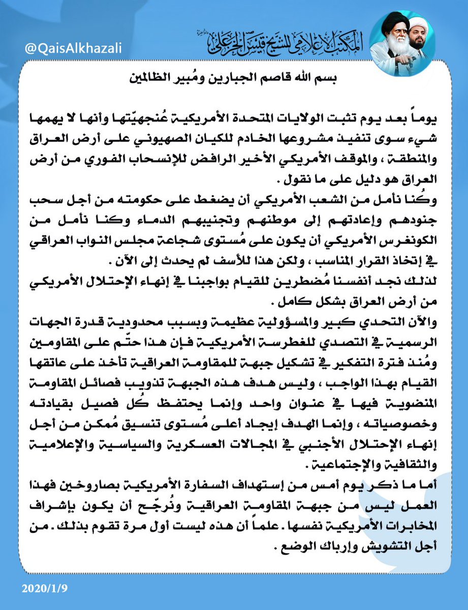 لذلك نقولها من جديد لقوات الإحتلال الأمريكية ، بما أنكُم رفضتم الإنسحاب من أرض العراق الطاهرة فترقبوا الرد العراقي المزلزل ، وإن غداً لناظره لقريب .