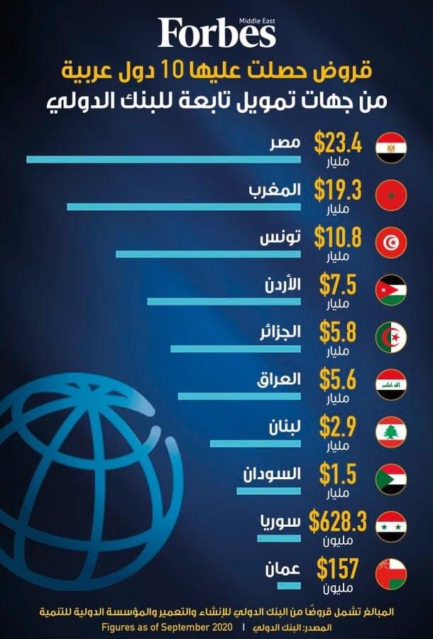 وحصلت مصر على الحجم الأكبر من القروض بنحو 23.4 مليار دولار، فيما اقترضت المغرب 19.3 مليار دولار