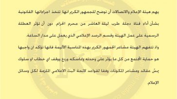 • هيئة الاعلام والاتصالات تتخذ اجراءات قانونية بحق قناة دجلة طرب