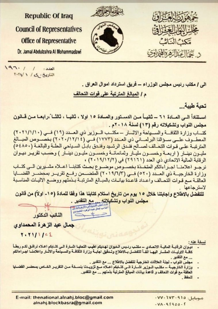 وقال المحمداوي في بيان صحفي ” وجهنا كتابا رسميا إلى مكتب رئيس الوزراء /فريق استرداد أموال العراق وقد خاطبنا وزارة الثقافة سابقا بسؤال برلماني في (١٤/ ١٢ / ٢٠٢٠) بشأن المبالغ المترتبة على قوات التحالف الدولي لصالح فندقي الرشيد وبابل السياحي والبالغة ( ٥٤٨٥٠)مليون دينار (أربعة وخمسون مليار وثمانمائة مليون دينار) وحسب تقارير ديوان الرقابة المالية الاتحادية “.