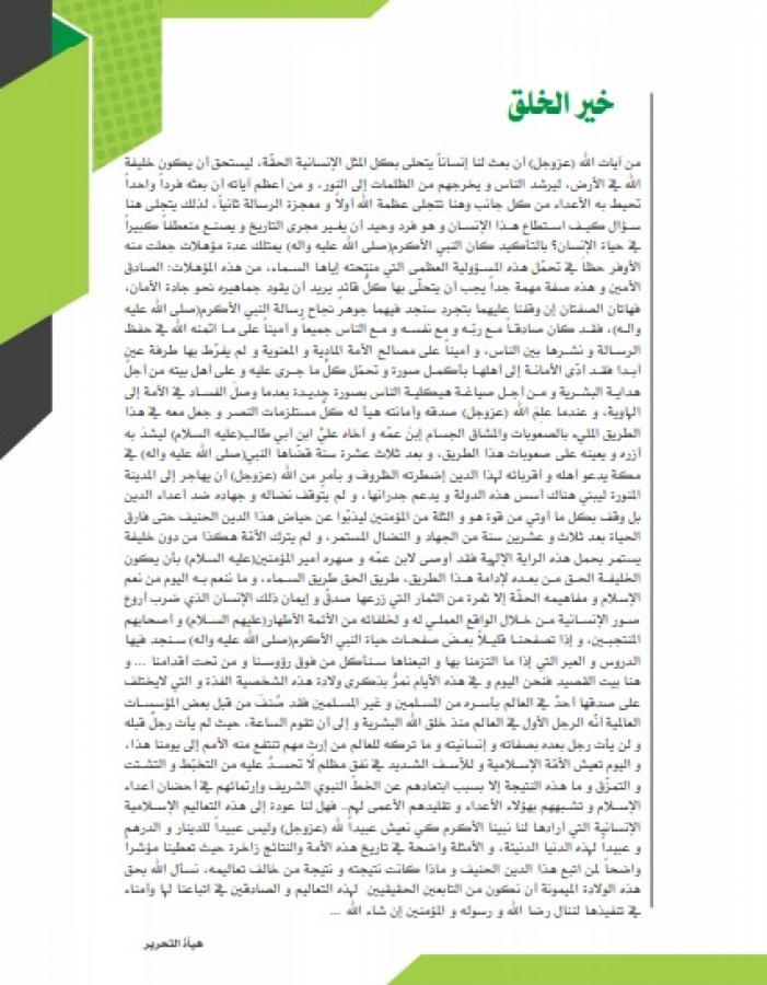 وأضاف, إن” العدد الجديد تناول مجموعة من المواضيع والتحقيقات ، فضلا عن مجموعة من المقالات الدينية والثقافية والأدبية التي تحتويها أبواب المجلة الثابتة, وهي ( فقه وقرآن، من وحي الوصي، مكتبات، الأدبية، منوعات، المرافئ، أروقة نجفية، براعم وقوارير، الشباب).