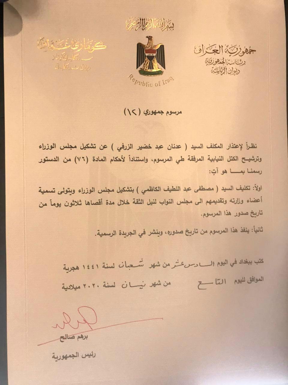 in السياسية عاجل:رئيس الجمهورية يكلف الكاظمي رئيساً للحكومة المؤقتة بحضور زعماء الكتل السياسية 9 أبريل، 2020, 10:24 ص