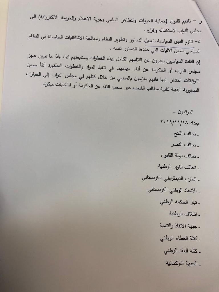 اسفر اجتماع بأعلى مستوى عقد مساء اليوم برئاسة الرئيس برهم صالح، وحضور زعماء جميع المكونات السياسية، وغياب رئيس الوزراء عادل عبد المهدي، عن اتفاق سياسي تضمن العديد من المحاور المهمة، بينها امهال رئيس الحكومة 45 يوما لتنفيذ الإصلاحات، واجراء تغيير وزاري واسع، وإجراءات تتعلق بالتظاهرات، وبمكافحة الفساد، وتعديل قانون الانتخابات، وتغيير مفوضية الانتخابات بالكامل، والغاء امتيازات المسؤولين.. وغير ذلك.