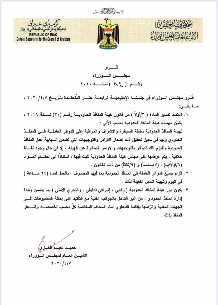 اتخذ مجلس الوزراء جملة من القرارات في جلسته الاعتيادية في 7 نيسان 2020 والتي عقدت برئاسة نائب رئيس الوزراء وزير النفط السيد ثامر الغضبان. ومن ضمن القرارات المتخذة قرارات ملزمة التطبيق لتعزيز دور هيأة المنافذالحدودية في الإشراف والرقابة على الدوائر العاملة في المنافذ الحدوديةوضمان وحدة الإدارة في المنافذ كافة.
