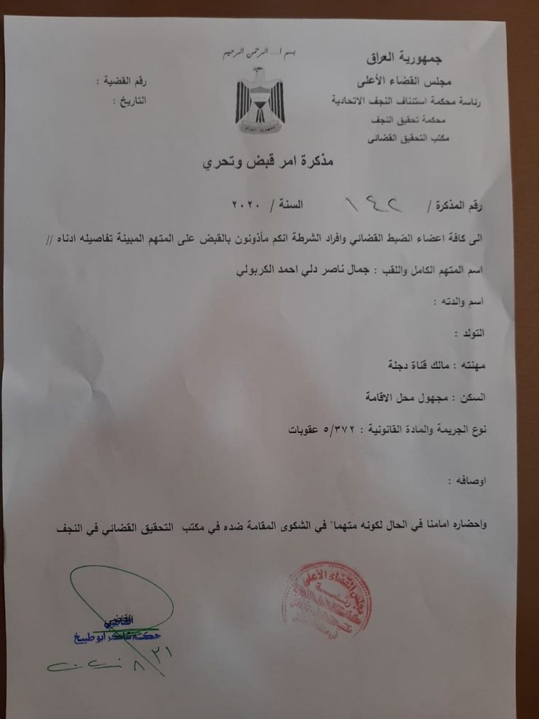 in محلية مذكرة القاء قبض بحق الكربولي مالك قناة دجلة من محكمة النجف 31 أغسطس، 2020, 11:10 ص القضاء النجفي يصدر مذكرة قبض بحق مالك قناة دجلة جمال الكربولي بناء على شكوى تقدم بها محامي النجف الاشرف
