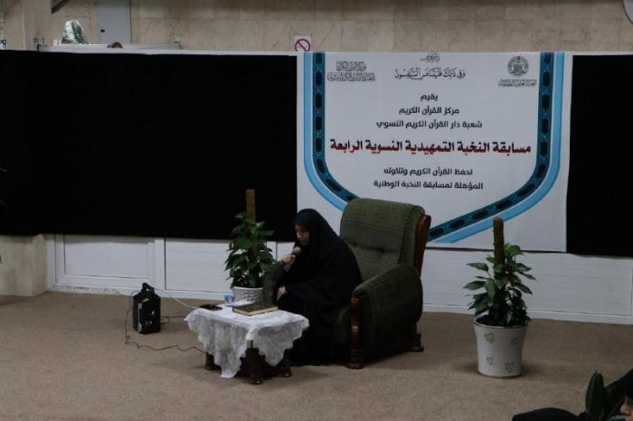 أطلقت شعبة دار القرآن الكريم النسوي في مركز القرآن الكريم (مسابقة النخبة التمهيدية النسوية) الرابعة ، بمشاركة تسع متسابقات من منسوبات وطالبات دار القرآن الكريم النسوي ، وذلك في قاعة سيد الأوصياء (عليه السلام) في العتبة العلوية المقدسة .