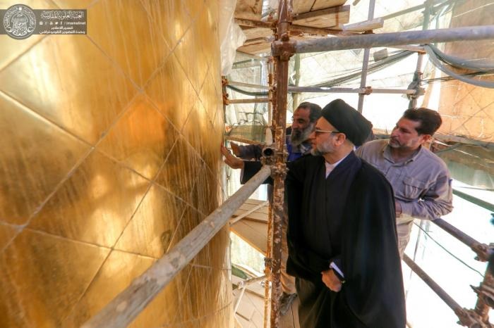 اطلع رئيس ديوان الوقف الشيعي, السيد علاء الموسوي, يرافقه الأمين العام للعتبة العلوية المقدسة, المهندس يوسف الشيخ راضي, وأعضاء مجلس الإدارة, على مشروعي تذهيب منارتي باب الاستئذان ومشروع نقل منظومة التبريد المركزي للقبة المطهرة.