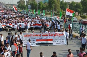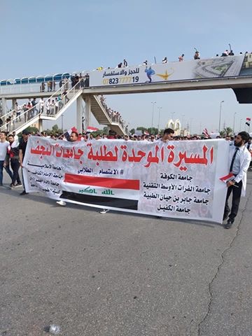 بالصور …..خروج طلبة الجامعات العراقية في النجف الاشرف بمسيرة موحدة دعما للمتظاهرين ولمطالبهم ، حاملين لافتات تؤيد مظاهرات اكتوبر وتؤكد الاستمرار بالاضراب لحين تحقيق المطالب وشاركه في المسيرة الموحدة طلبة جامعة الكوفة وجامعة جابر بن حيان والجامعات والكليات الاهلية في النجف الاشرف.